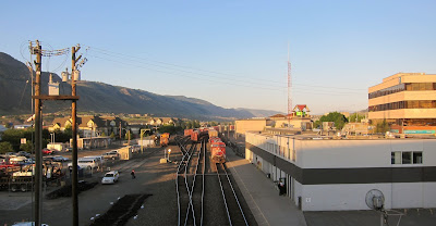 In late evening light a westbound stack train enters with a GE AC44CW on the point, at the same time as an eastbound empty grain train enters the depot area from the opposite direction. Both locomotives have just had a crew change. (Geoff Churchman pics)