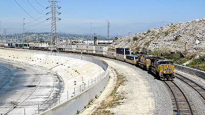 With an AC45CCTE behind it on the front of a stack train beside the L.A. River.