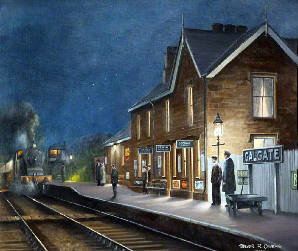 This painting of Galgate Station by night, showing the platform and a train approaching from the left. It was painted to celebrate the 150th anniversary of local railways in Lancaster. Galgate was one of six stations on the original line from Preston to Lancaster and opened in 1840, but closed due to failing demand in 1939. The station buildings were later demolished. (Source)